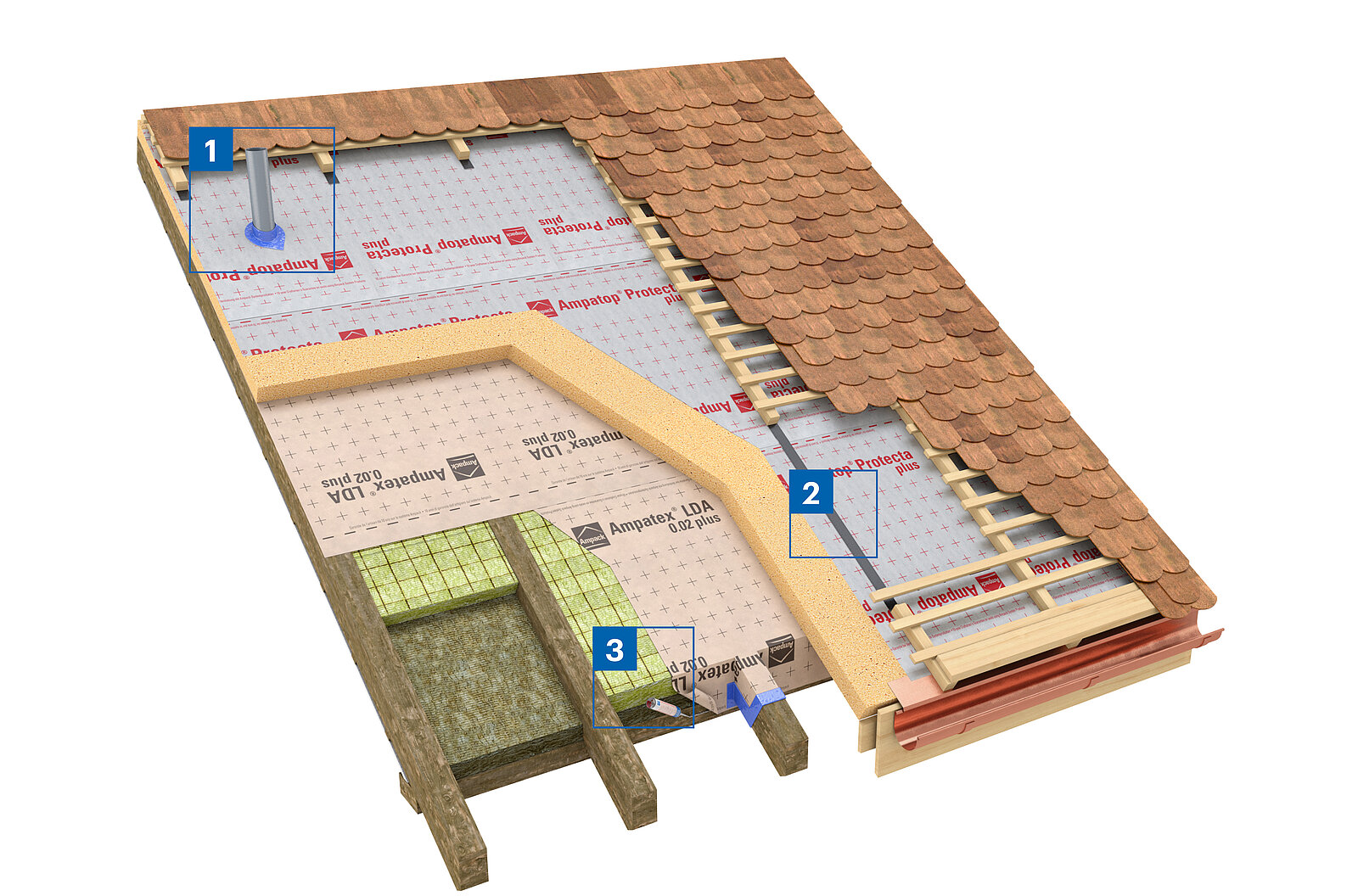Die Ampatex LDA 0.02 plus wird als Luftdichtheitsschicht bei der Sanierung des Daches mit Verbleib der bestehenden Zwischensparrendämmung eingesetzt, wenn die raumseitige Verkleidung nicht luftdicht ist. Zuerst müssen die Sparrenfelder vollgedämmt werden. Zwischen Dämmung und Sparrenoberkante darf unter keinen Umständen ein Hohlraum vorhanden sein. Ampatex LDA 0.02 plus wird anschliessend parallel zur Traufe und mit der bedruckten Seite zum Verarbeiter hin zeigend auf vorhandene Tragkonstruktion, Schalung oder Gefachdämmung mit 10 cm Überlappung verlegt und im Überlappungsbereich verdeckt genagelt (Breitkopfnägel) oder geklammert. Überlappungen mittels integrierten Klebebändern luftdicht verkleben. Klebestelle gründlich anreiben. Querstösse ebenfalls 10 cm überlappen und mit Ampacoll Superfix oder Ampacoll XT 60 mm verkleben.